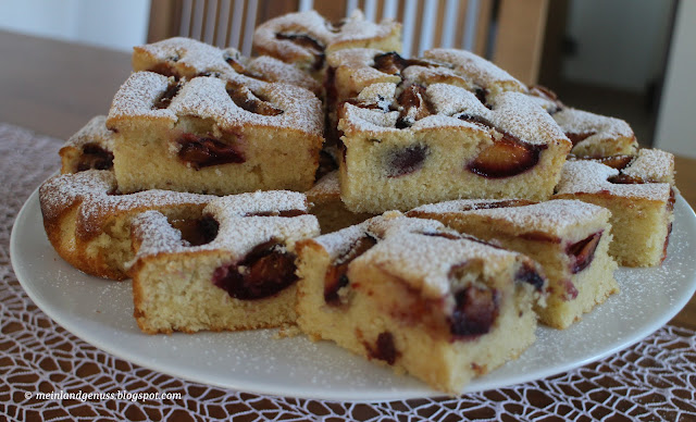 Und nun gehts los. Alle Zutaten, außer Zwetschgen in die Rührschüssel der Küchenmaschine geben und mit dem Schneebesen zu einem glatten Teig rühren. Teig in die Backform füllen, glattstreichen, mit den Früchten belegen und im Ofen für ca. 35 Minuten backen.